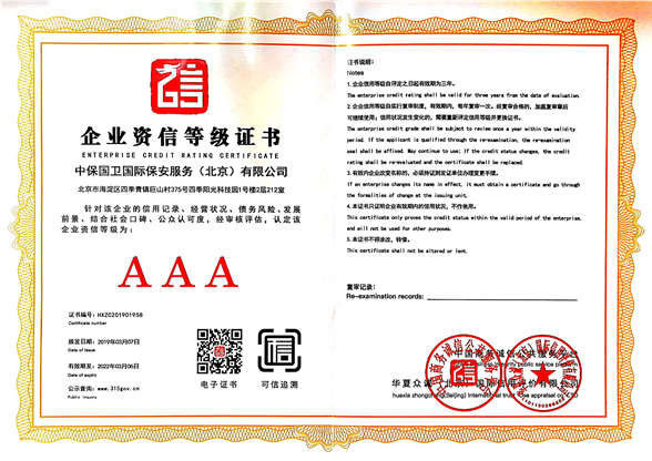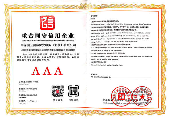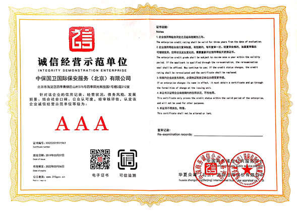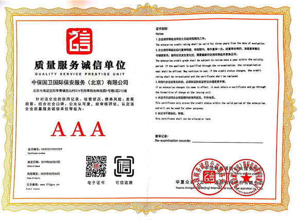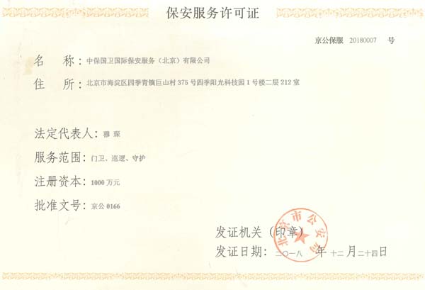 中保國(guó)衛(wèi)國(guó)際保安服務(wù)(北京)有限公司,屬中保國(guó)衛(wèi)集團(tuán)旗下子公司。能全方位的為大型客戶(hù)提供優(yōu)質(zhì)的安保、押運(yùn)服務(wù),是集人防和技防于一體的新型正規(guī)化綜合安保押運(yùn)服務(wù)企業(yè),提供人防、物防、技防、聯(lián)網(wǎng)報(bào)*、非武裝押運(yùn)等安防相關(guān)的一站式服務(wù)。 公司在國(guó)內(nèi)多省設(shè)立有分公司及分支機(jī)構(gòu),著重提升安全押運(yùn)、智能技術(shù)押運(yùn)及安全技術(shù)防范相關(guān)的服務(wù),業(yè)務(wù)范圍覆蓋全國(guó)一、二線城市、港澳地區(qū)以及海外地區(qū)。安保方面主要為政府機(jī)構(gòu)、金融機(jī)構(gòu)、企事業(yè)單位、醫(yī)療衛(wèi)生、高等院校、工業(yè)園區(qū)、大型商場(chǎng)、高檔住宅、智能商務(wù)樓、大型活動(dòng)提供門(mén)衛(wèi)、守護(hù)、巡邏、押運(yùn)(非武裝)、安全檢查、保安特勤、私人護(hù)衛(wèi)、消防中控、安全技術(shù)防范、遠(yuǎn)洋護(hù)航等全方位服務(wù),同時(shí)面向國(guó)際市場(chǎng),為中資企業(yè)在“一帶一路”沿線國(guó)家投資提供境外安保服務(wù)。 >> 更多內(nèi)容 |